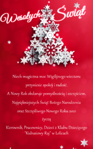 W dniach od 04.01.2021r. do 08.01.2021r. (przerwa zimowa), Klub Dziecięcy "Kubusiowy Raj" w Lelicach będzie nieczynny. Za utrudnienia przepraszamy.