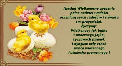 Życzenia radosnych Świąt Wielkanocnych, wypełnionych nadzieją budzącej się do życia wiosny. Pogody w sercu i radości płynącej ze Zmartwychwstania Pańskiego oraz smacznego święconego w gronie najbliższych życzą: P. O. Kierownik, Pracownicy, Dzieci z Klubu Dziecięcego "Kubusiowy Raj"...