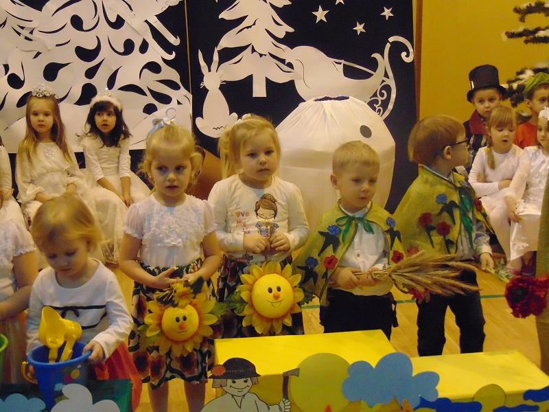 Maluchy w pięknych i kolorowych strojach dumnie prezentowały się i recytowały wiersze o kolejno następujących po sobie miesiącach, a jednocześnie o zmieniających się porach roku.