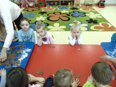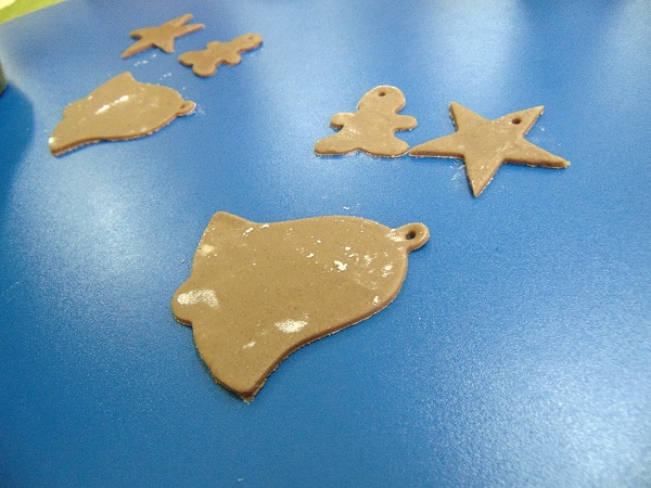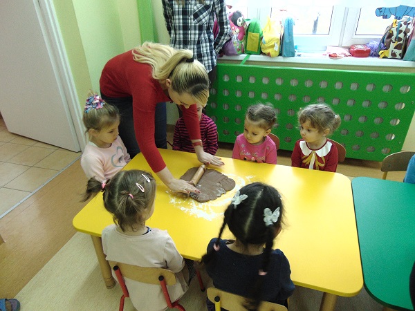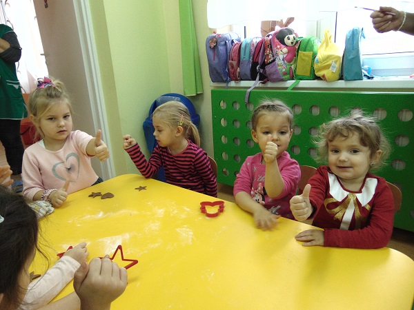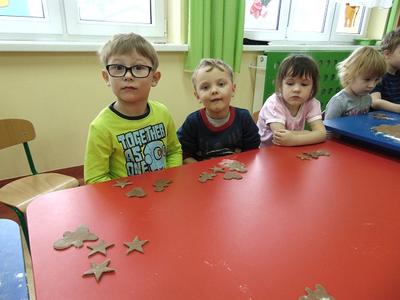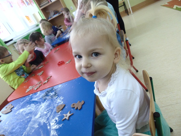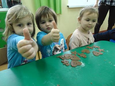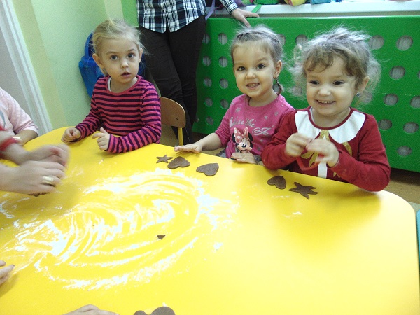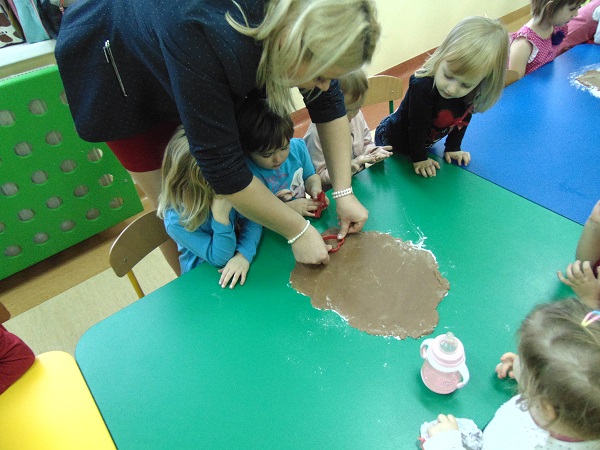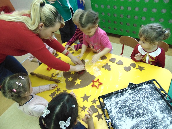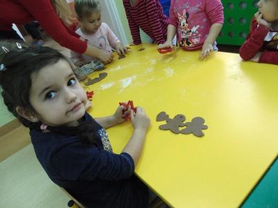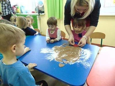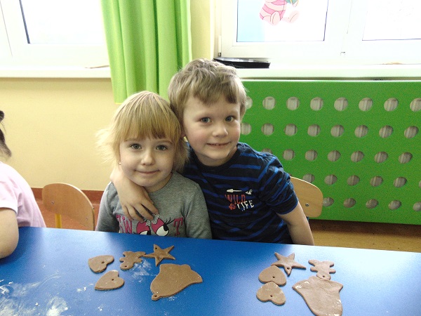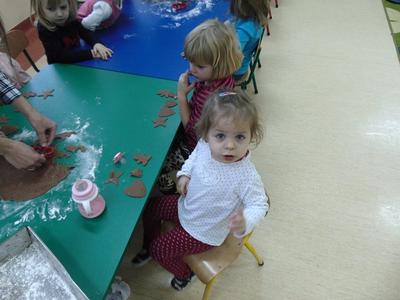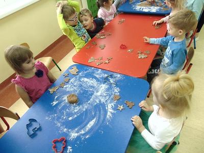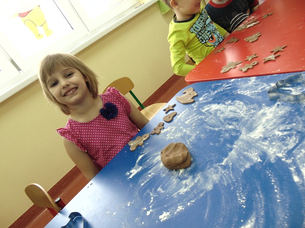 Z pomocą opiekunek praca z przygotowaniem wypieków szła sprawnie i bez trudu. Wszystkim podobało się wykrawanie świątecznych kształtów – gwiazdek, serduszek, dzwoneczków, przy pomocy foremek.