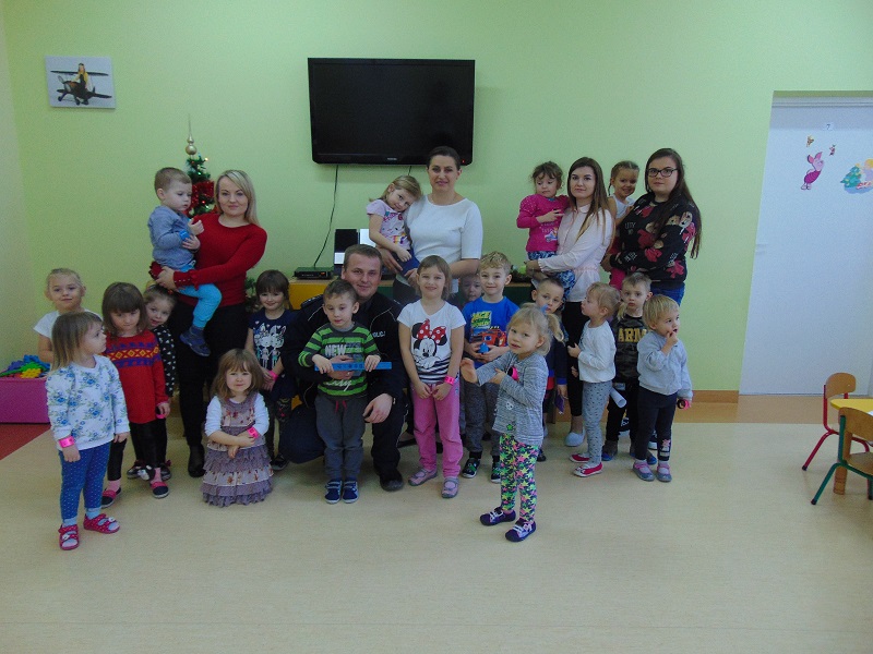 Dnia 12.12.2017r. Klub Dziecięcy „Kubusiowy Raj” w Lelicach odwiedził st. sierż. Marek Zdziebłowski. Pan Policjant przypominał dzieciom o zagrożeniach z którymi mogą się spotkać w trakcie ferii, opowiadał dzieciom jak należy zachowywać się podczas zabaw na świeżym powietrzu, oraz przypomniał o odpowiednim ubrania wychodząc na śnieg. Przestrzegał przed ślizganiem się na zamarzniętych stawach, oraz podał wskazówki jak bawić się na śniegu. Pan Policjant wytłumaczył jak należy zachować się w kontaktach z obcymi ludźmi, jak dbać o bezpieczeństwo własne i innych oraz do kogo zwracać się o pomoc w sytuacji zagrożenia. Na koniec spotkania dzieci otrzymały od Pana Policjanta opaski odblaskowe, które z radością zaraz założyły i obiecały, że będa nosiły codziennie.