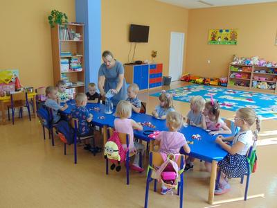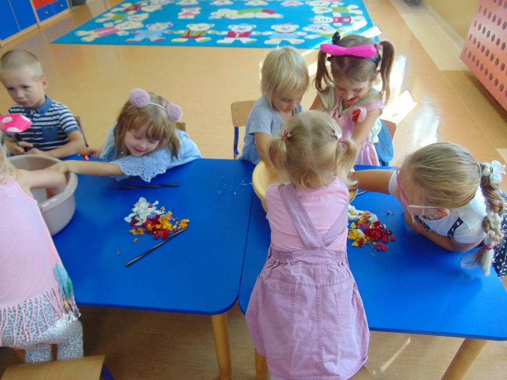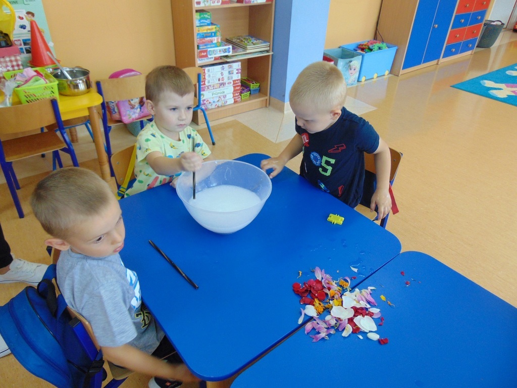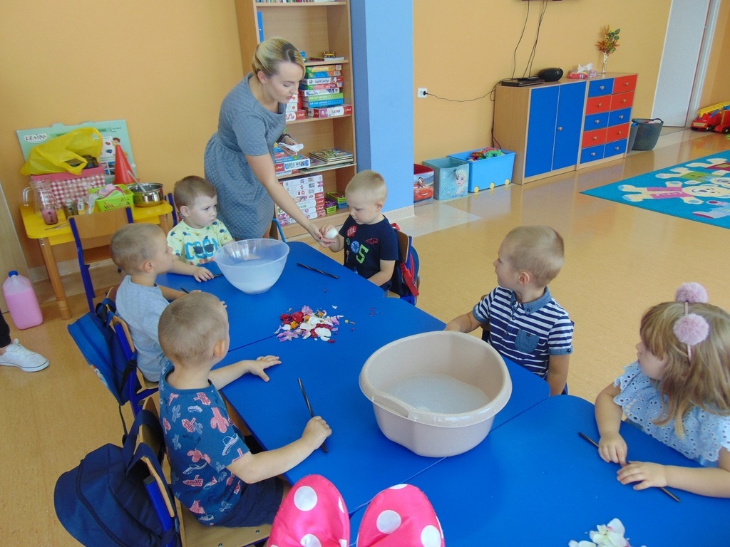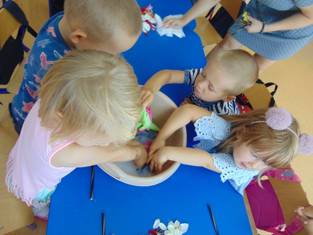 Dzieci z grupy starszej realizując cykl tematów o czystości, bardzo zainteresowały się mydłem, ponieważ w czasie zabiegów higienicznych bardzo często go używają. Podczas realizacji zajęć z mydłem, dzieci wysłuchały bajki o powstawaniu mydła, rozpuszczały mydło w wodzie, robiły pianę, prały ubranka dla lalek, myły rączki. Na zakończenie nie mogło zabraknąć samodzielnego robienia mydła przez dzieci. Podczas zajęć dzieci doskonale się bawiły przeprowadzając z mydłem różne doświadczenia i eksperymenty.
