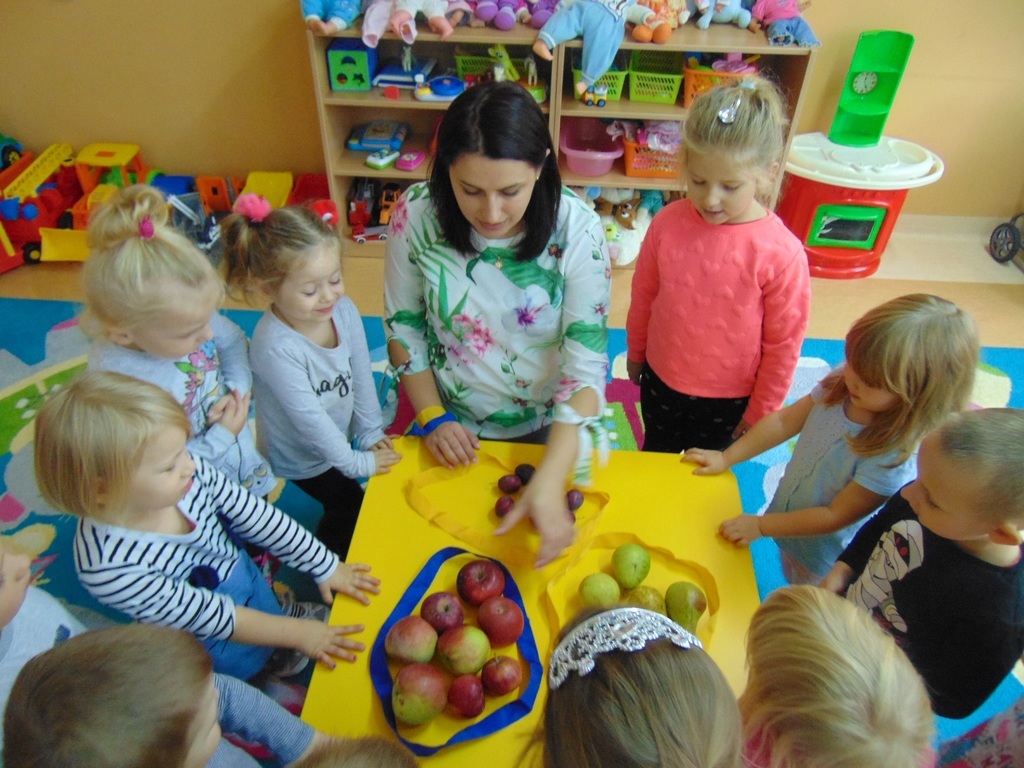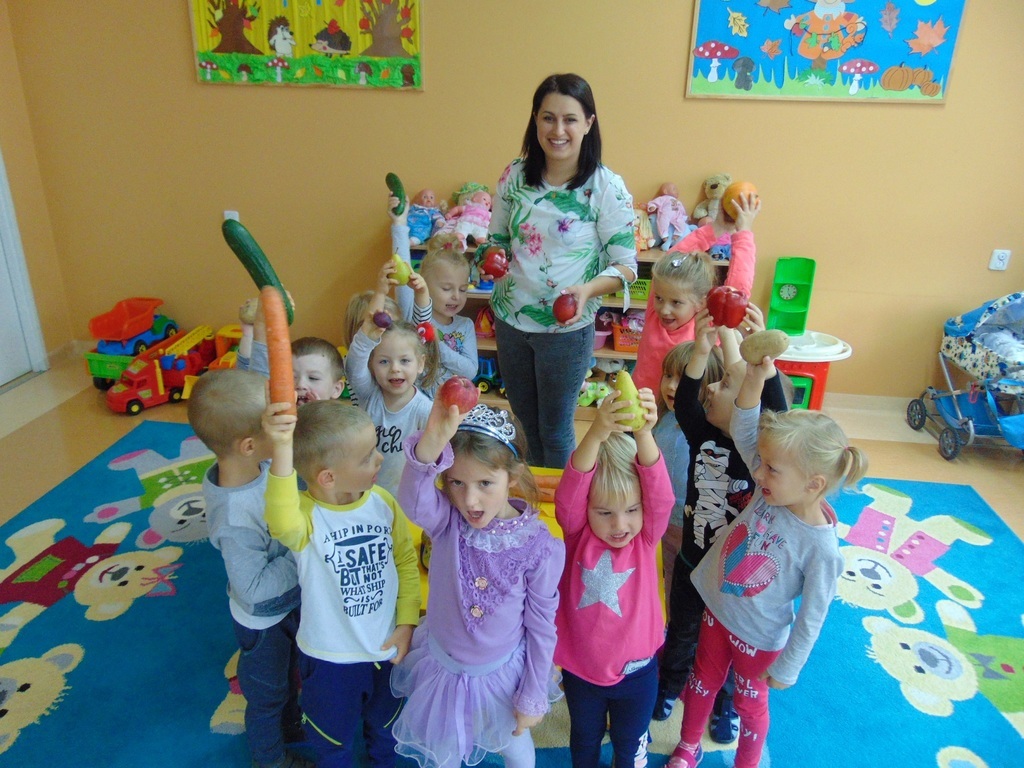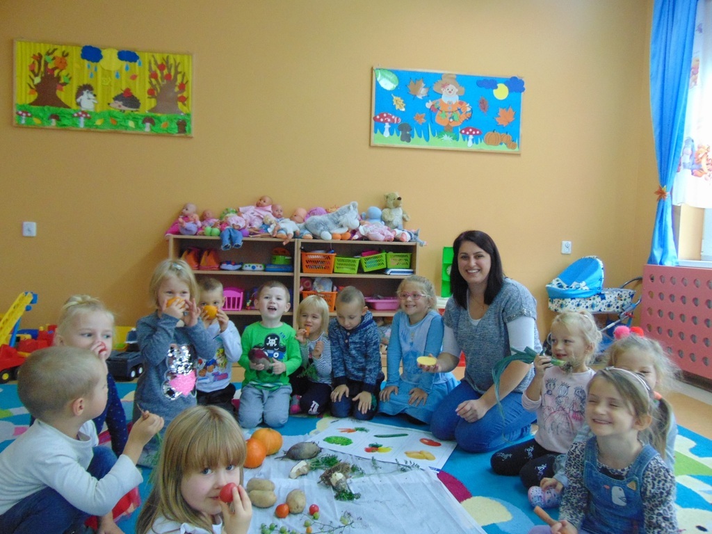 Pod takim hasłem dzieci poznawały znaczenie warzyw i owoców dla zdrowia. A przecież jesień to czas, kiedy zbieramy dary w sadach i ogrodach. Podczas zajęć dzieci rozpoznawały i nazywały wybrane owoce i warzywa, poznawały ich zapach i kształt. Dzieci doświadczyły smaków degustując dary jesieni z zamkniętymi oczami, co przyniosło wiele uśmiechu naszym pociechom. Efektem finałowym było przygotowanie przez dzieci smacznej surówki z marchewki i jabłka.