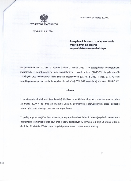W związku z poleceniem Wojewody Mazowieckiego z dnia 24 marca 2020 roku, Wójt Gminy Gozdowo wydał Zarządzenie Nr 36/2020 z dnia 26 marca 2020r. w sprawie zawieszenia świadczenia opieki w Klubach Dziecięcych prowadzonych przez Gminę Gozdowo od 26 marca 2020 roku do 10 kwietnia 2020r.