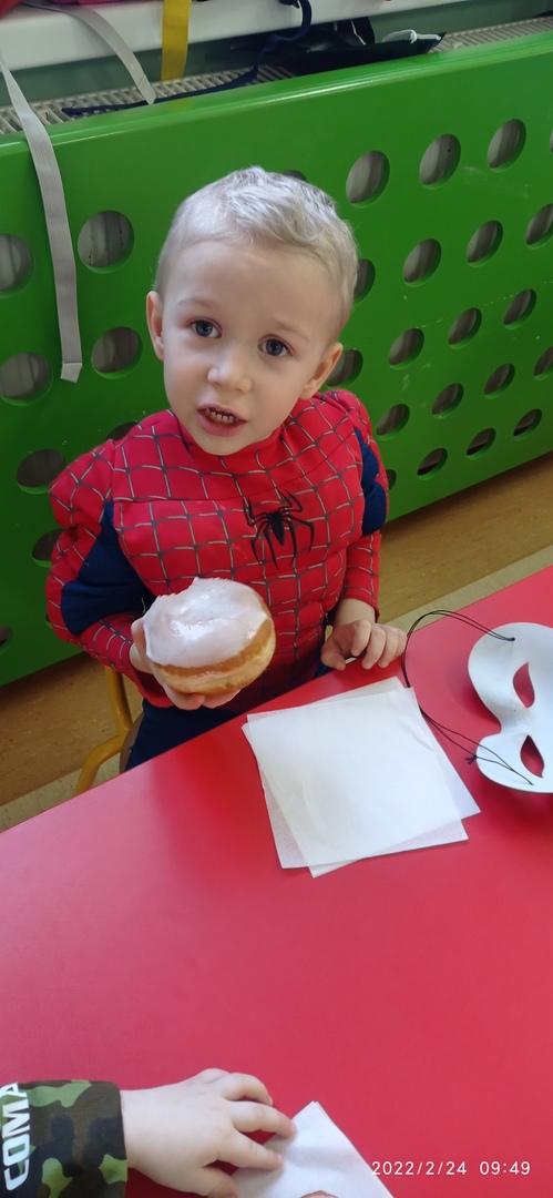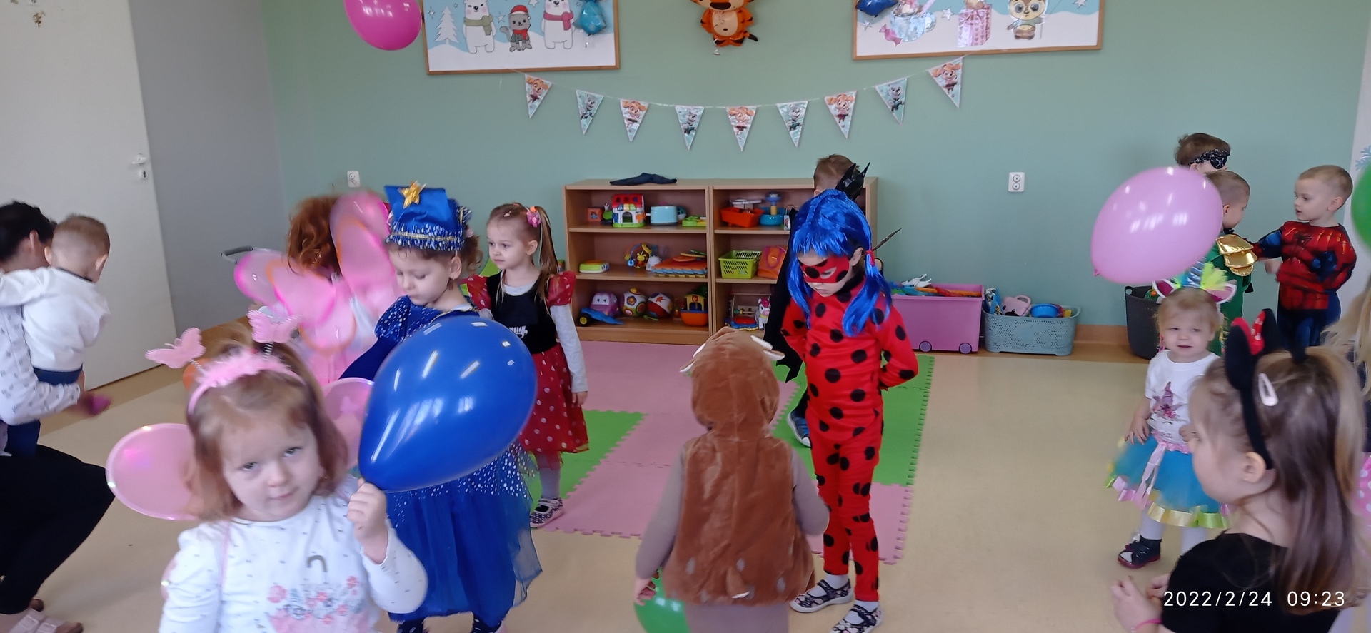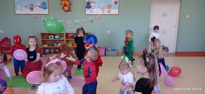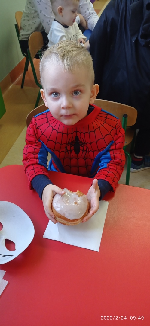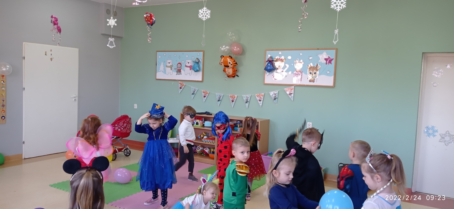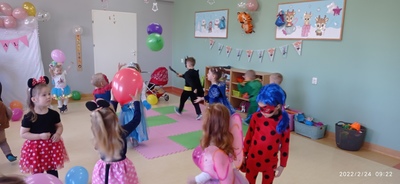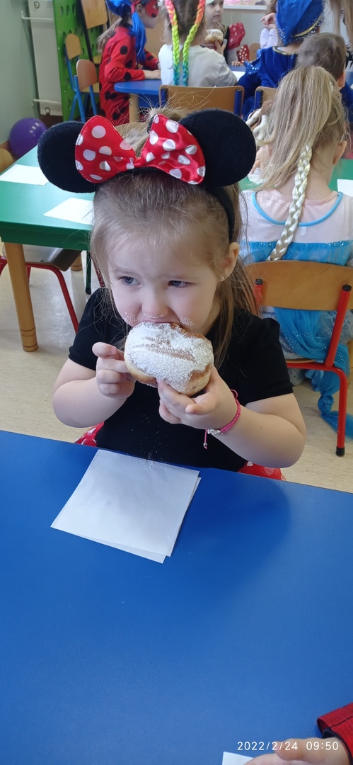 Karnawał to czas uczt i zabaw. Najhuczniej i najweselej obchodzimy „Ostatki” - ostatki dzień karnawału, a przede wszystkim Tłusty Czwartek. W dniu 24.02.2022r. w naszym Klubie odbył się długo wyczekiwany bal karnawałowy - niezwykłe wydarzenie. Po śniadaniu w naszej sali pojawiały się kolorowe postacie. Nie sposób zliczyć i wymienić tych wszystkich postaci. Dzieci świetnie się bawiły uczestnicząc wspólnie ze swoimi paniami w zabawach i pląsach. W sali w czasie tańców było bardzo kolorowo, wszyscy bawili się wesoło, uśmiech nie znikał z twarzy mimo chwilowego zmęczenia. Oczywiście nie odbyło się bez degustacji pysznych pączków w naszym Klubie. Dziękujemy dzieciom i rodzicom za zaangażowanie w przygotowanie pięknych balowych strojów. Kolejny bal karnawałowy już za rok!